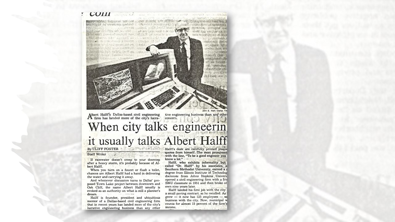 Firm founder Dr. Halff was featured in a 1984 Dallas Morning News piece titled “When city talks engineering, it usually talks Albert Halff.”